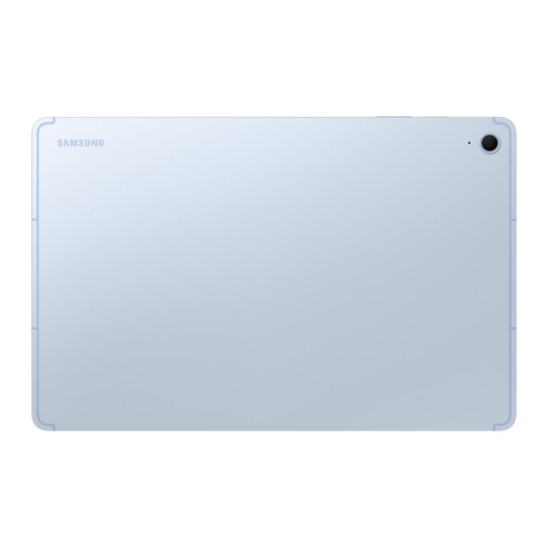 Galaxy Tab S10 FE+ серого цвета показан спереди с сине-зелеными обоями на экране, сзади с прикрепленной на задней панели ручкой S Pen и сбоку, чтобы подчеркнуть тонкий дизайн.
